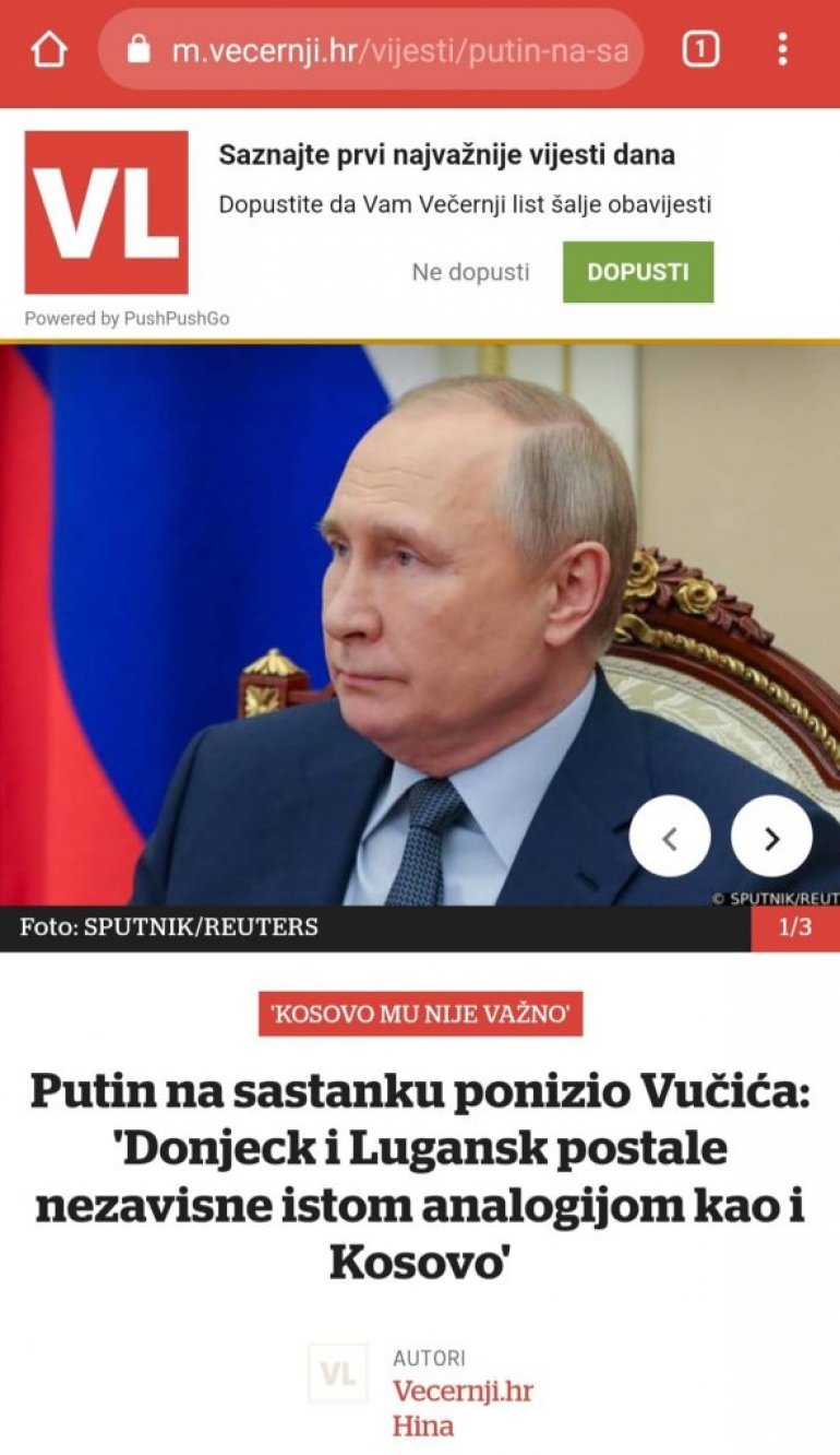 Регионални медији показали су патолошку опседнутост Србијом и њеним председником Александром Вучићем, у текстовима који се односе на став који је изнео лидер Руске Федерације Владимир Путин, у којем он појашњава зашто Москва има право да призна Доњецку и Луганску Републику, користећи се преседаном који је установио Међународни суд правде по питању Косова.