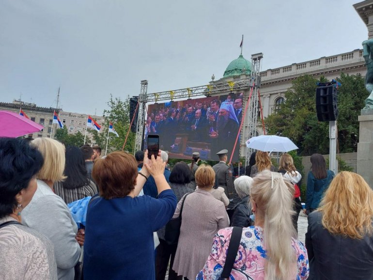 Окупљени грађани, упркос киши и молбама председника, нису се разишли и на видео биму су гледали пренос полагања заклетве.