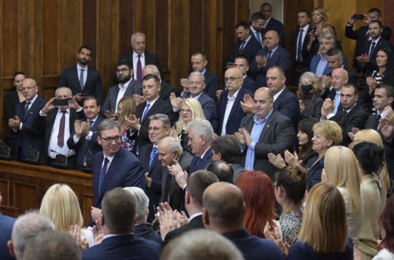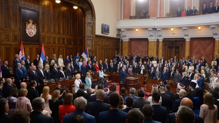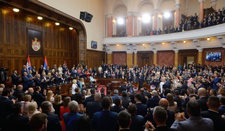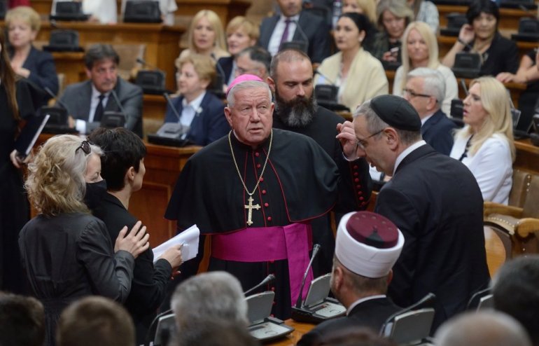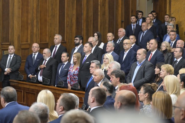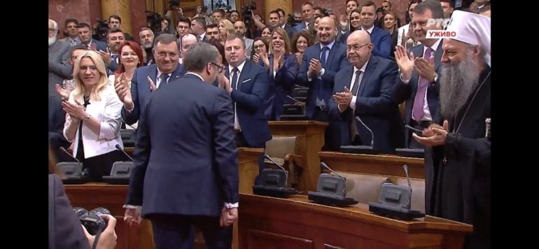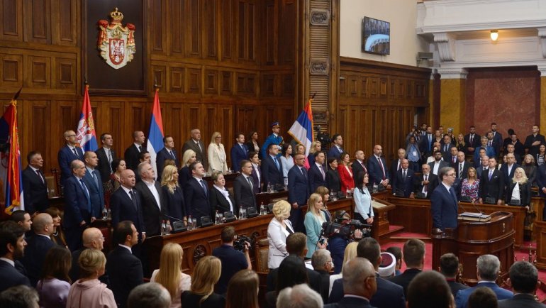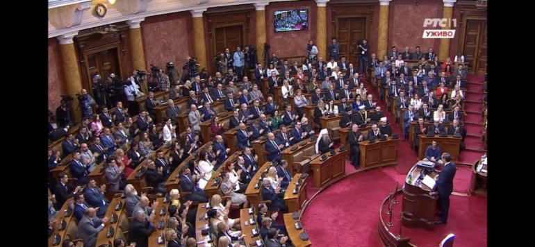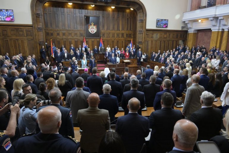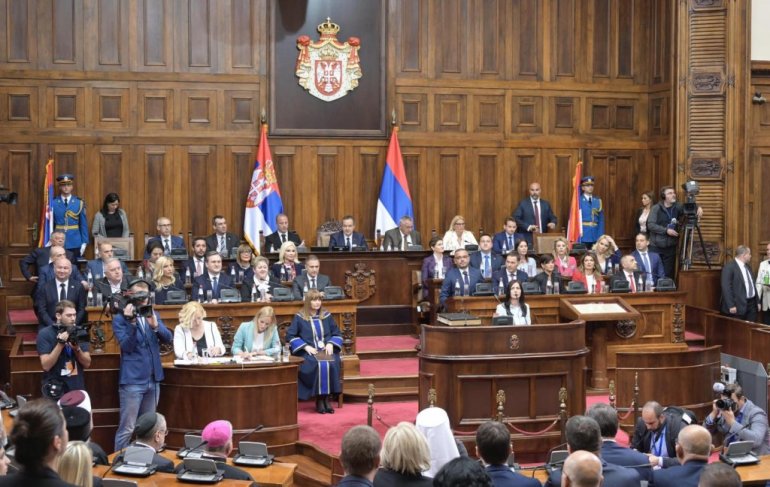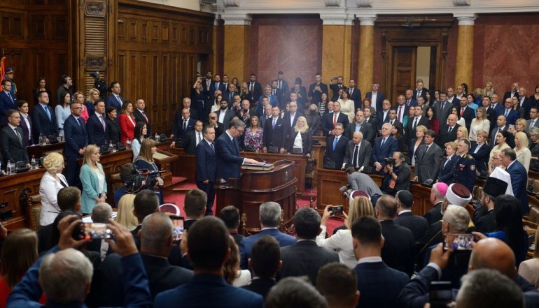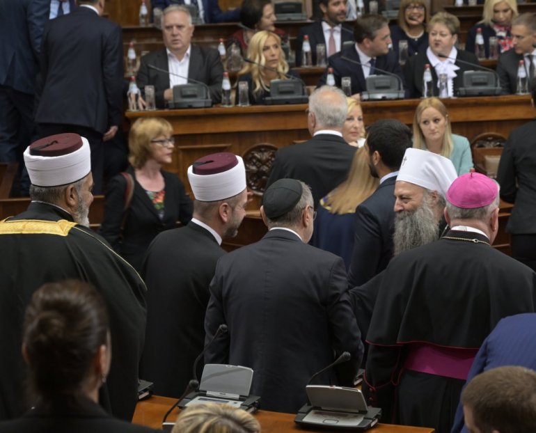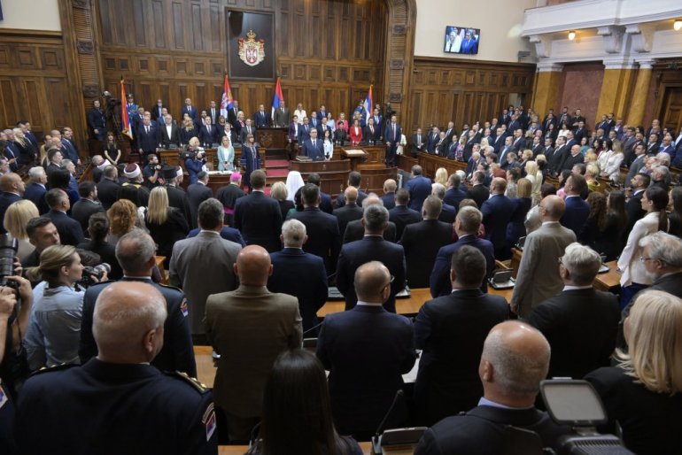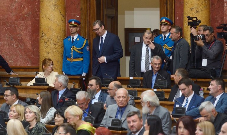 Највиши државни званичници стигли су у салу Скупштине. Ту су Ана Брнбић, Синиша Мали, Александар Вулин, Јадранка Јоксимовић и други. Присутан је и Његова светост патријарх српски Порфирије, као и представници исламске и католичке заједнице у Србији.