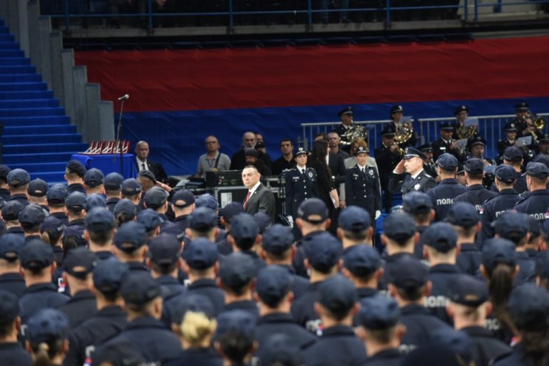 - У име председника Републике Србије Александра Вучића, припадницима Министарства унутрашњих послова честитам полагање свечане заклетве. Ево нас данас пред Србијом и пред српским светом да покажемо шта смо радили у протеклој години, да покажемо најмлађе међу нама, а Бог и народ ће дати да их једном зовемо и најбољи међу нама. Али до тада, док су најмлађи, хоћу да знате да они бољи од њих су сада у Копненој зони безбедности, су сада на раскрсницама, сада дежурају не би ли неком спасили главу ако га ватра у неопрезу захвати, да су најбољи међу нама данас са онима који пате, којима је тешко, далеко од светла и далеко од камера, па ваљда зато и јесу најбољи. Ево, пред нама 1.516 кћери и синова. Оно што су мајке од киле меса отхраниле, мајка Србија је дохранила да дорасту до строја и до барјака - поручио је министар полиције Александар Вулин.