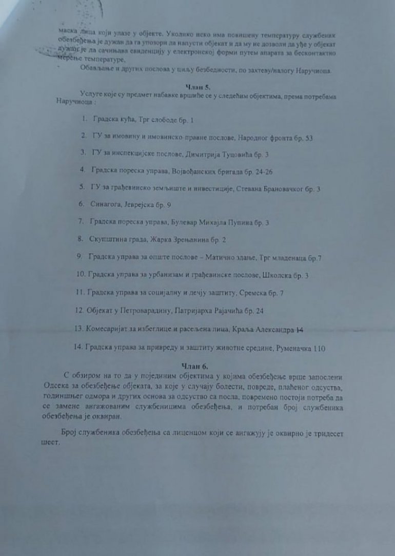 У члану 5 јасно је написано који се објекти у Новом Саду, према потребама наручиоца, чувају овим уговором: