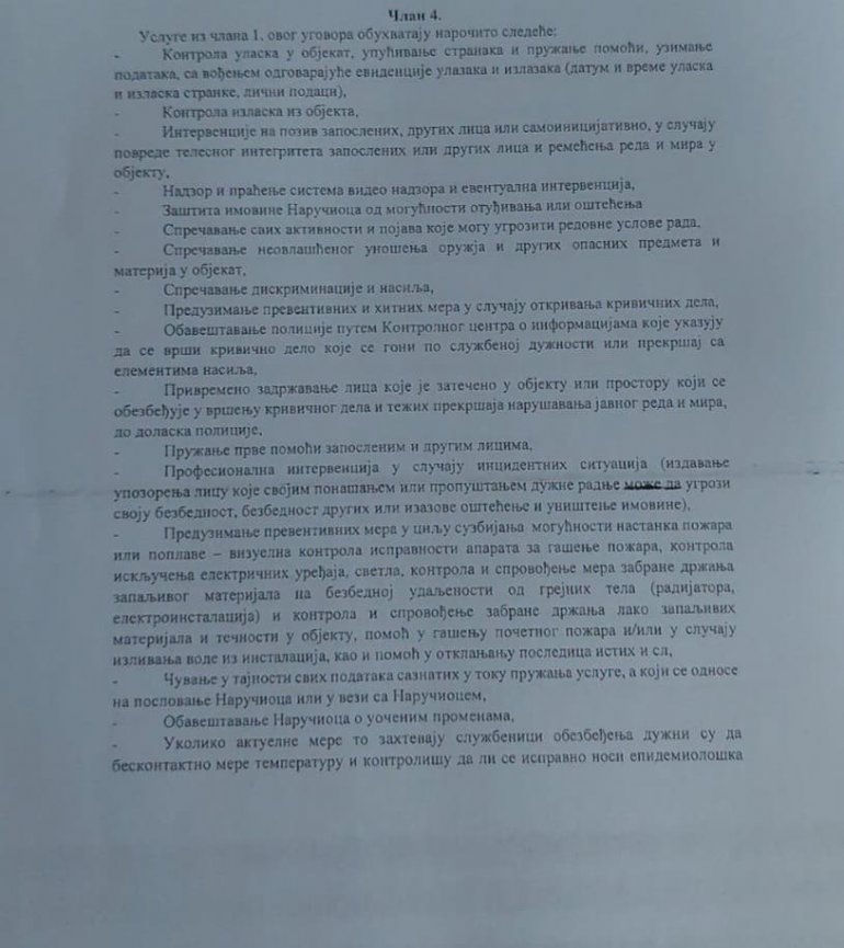 У члану 1 прецизира се да су предмету Уговора услуге – физичко обезбеђење објекта, док је у члану 4 Уговора таксативно наведено које су то све услуге: