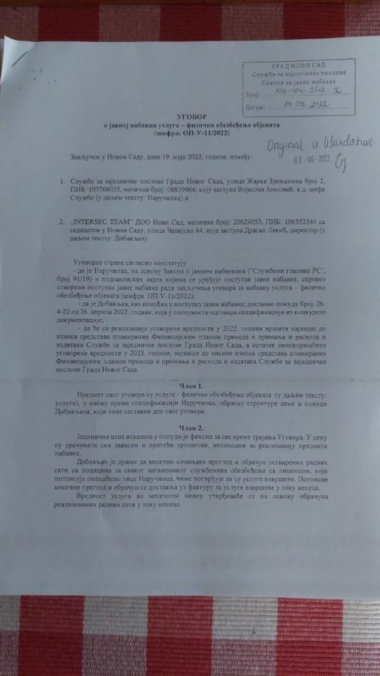 Уговор између “InterSec team” и Службе за заједничке послове коју заступа в. д. шефа Службе Војислав Јоксовић склопљен је 19. маја 2022. године.