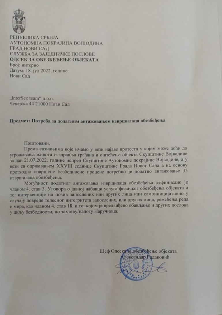 Реч је о провереној фирми “InterSec team d.o.o.”, лиценцинарој агенцији за послове обезбеђење које је на тендеру добила посао обезбеђења објеката Скупштине града Новог Сада у складу да законом, и која већ годинама пружа своје услуге Граду.