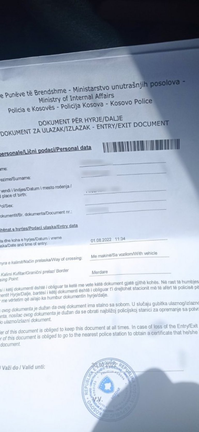 На пулту косовске полиције путницима са српским личним картама полицајци издају декларациони папир који иде из личну карту и који важи 90 дана.