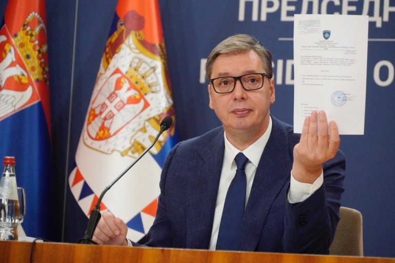 - Ми смо тражили да се отвори расправа о заједници ЗСО и тражили смо још неколико ствари. Према Приштини, Србин на сваких 90 дана мора да добије визу да живи у рођеној кући, а Квинта сагласна - рекао је председник показавши папир који би Приштина да изда Србима са Севера и додао:
