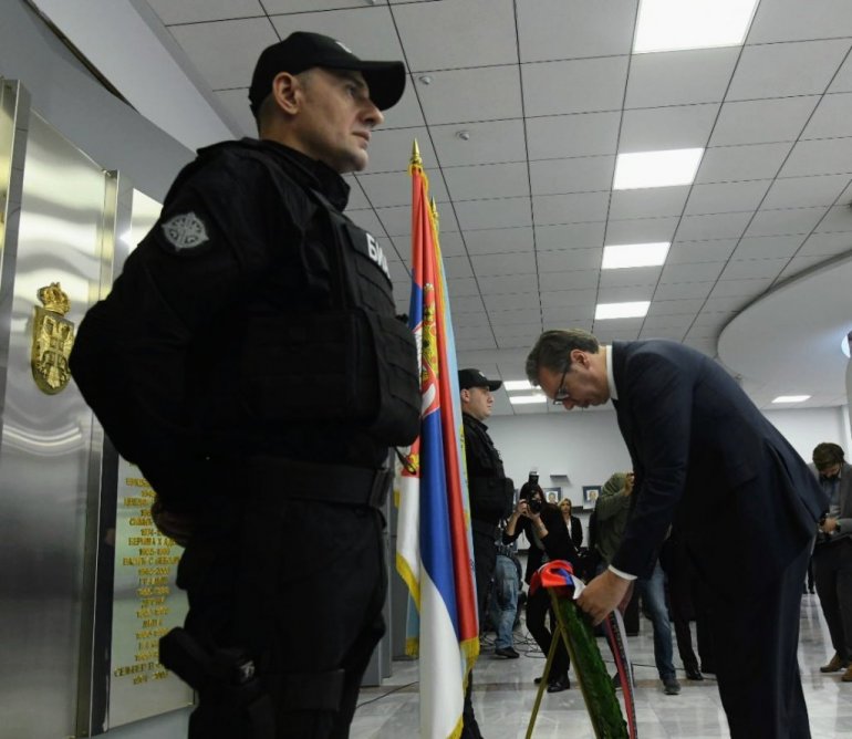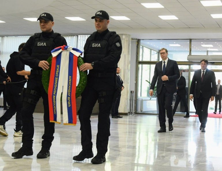 Вучић је по уласку у зграду положио венац испред плоче са именима погинулих припадника српске безбедносне агенције.