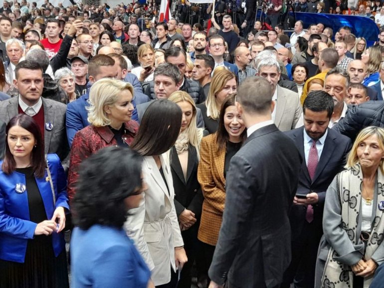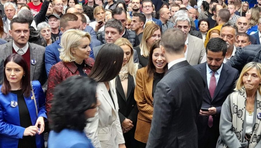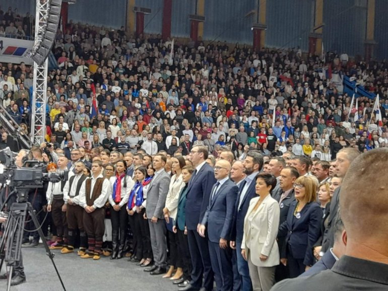 Председник Вучић при уласку у халу поздрављен бурним аплаузом уз скандирањем "Ацо Србине". У првим редовима крај Вучића су његови најближи сарадници, премијерка и чланови Владе Србије.