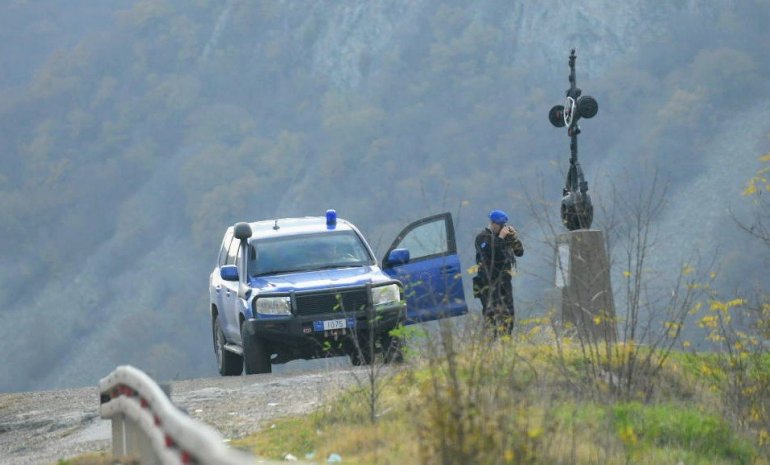 Надомак самог пункта, са десне стране, идући ка Лепосавићу, налази се возило Еулекс полиције, чије смо припаднике затекли како двогледом гледају предео око административног прелаза.