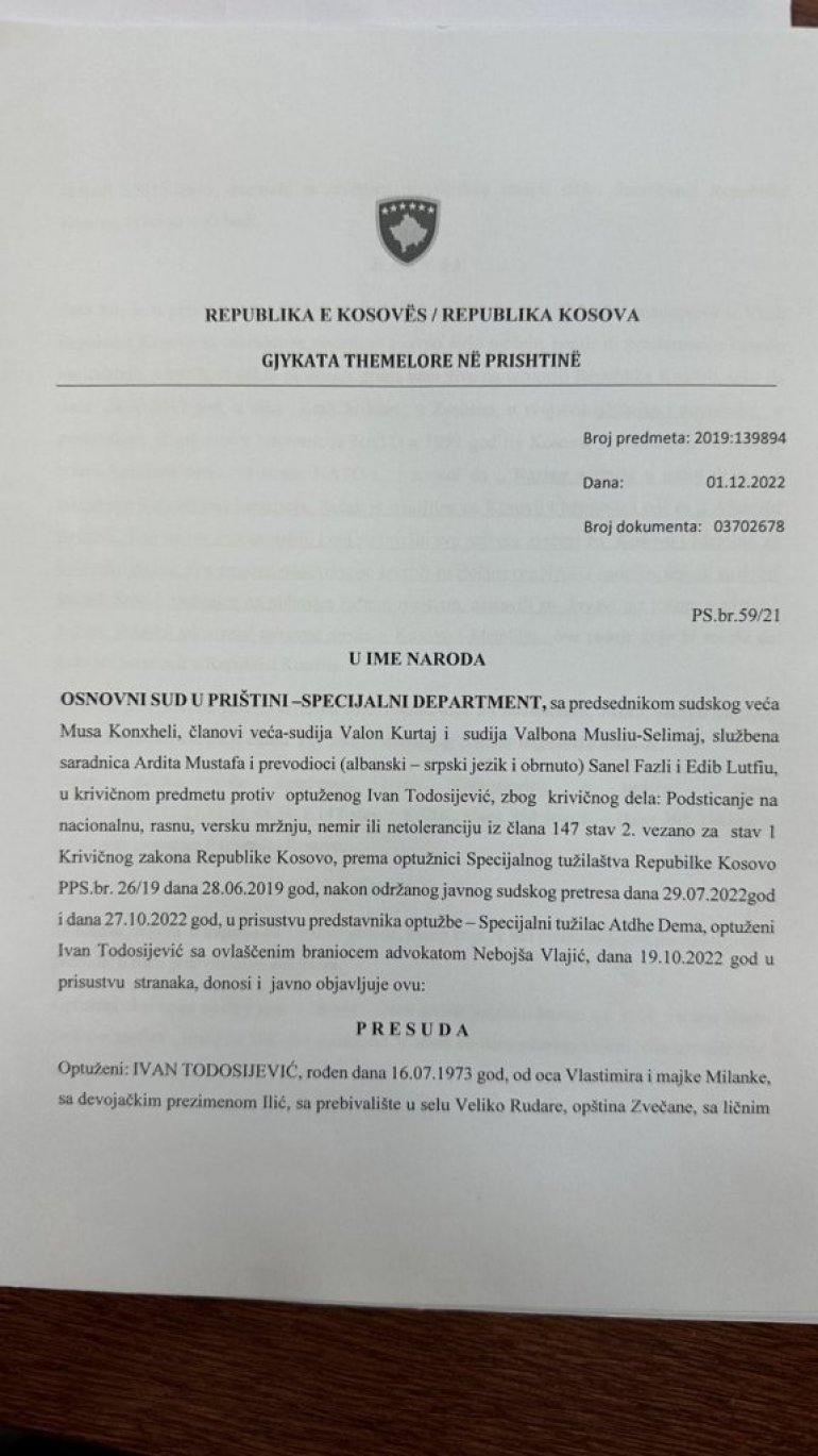 ИВАНУ Тодосијевићу данас је стигла писана и преведена пресуда којом је у октобру ове године осуђен на годину дана затвора због наводног подстицања на националну, расну и верску мржњу, сазнају Новости, а све зато што је читавом свету рекао истину о Рачку.