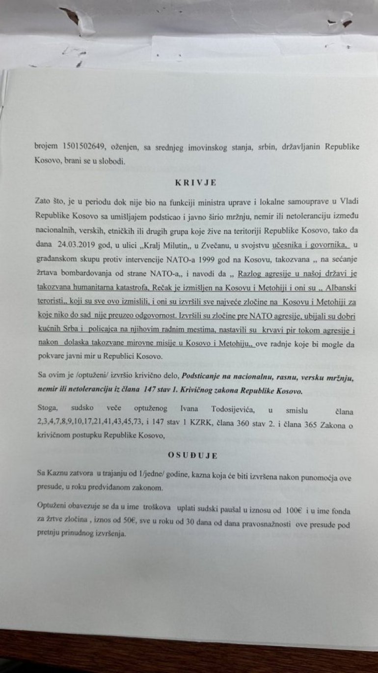 Овом драконском пресудом, из октобра ове године, Курти је брутално прегазио одредбе Бриселског споразума које се тичу права на правично суђење Србима који долазе из српских средина. Овим Приштина жели да укине слободу говора за сваког Србина на Косову и Метохији. Србима се брани да слободно говоре и мисле.
