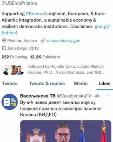 Твитер профил Амбасаде САД у Приштини "лајковао" је синоћ објаву "Васељенске ТВ“ у којој је председник Србије Александар Вучић поручио да је девет земаља повукло признање Косова.