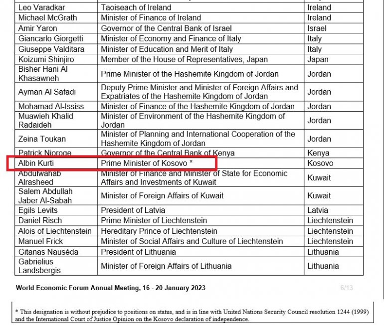 АЉБИН Курти ће у Давосу на Светском економском форуму говорити као "премијер Косова*", а у фусноти је наведено да то не прејудицира ставове о статусу.