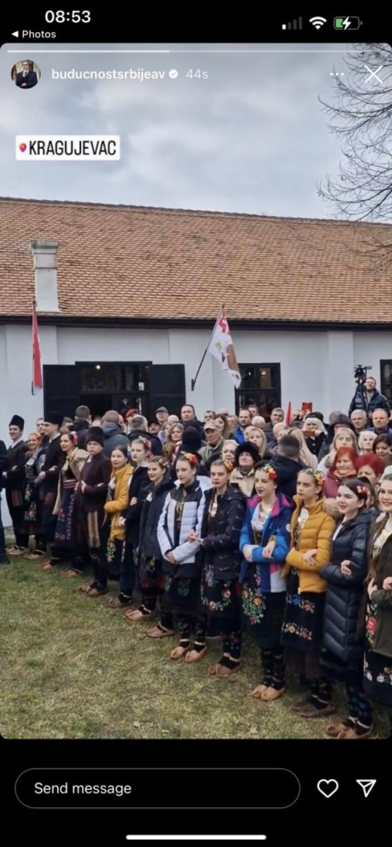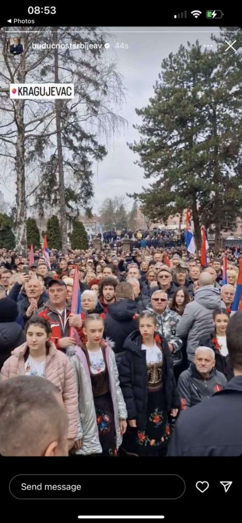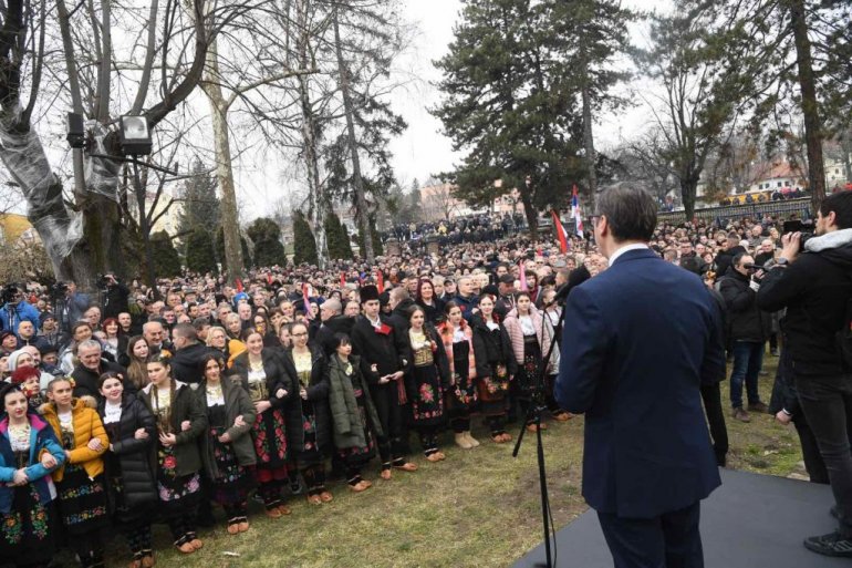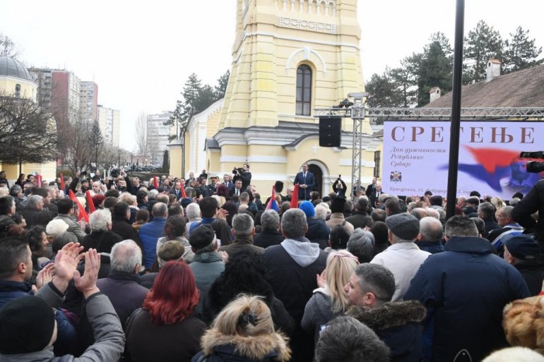 - Будите уз своју Србију на озбиљан начин, да сачувамо своју земљу, Косово и Метохију. Хвала вам на великој подршци. Хвала на предивном дочеку. Сретење је наше име и презиме. Нека живи Крагујевац, нека живи јуначка Шумадија - поручује председник.