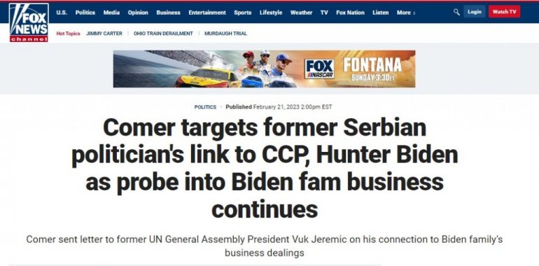 НАДЗОРНИ одбор Представничког дома под вођством републиканаца наставио је у уторак истрагу послова породице Бајден, и послали су писмо председнику Народне странке Вуку Јеремићу којим је затражена документацију о његовим везама са Хантером Бајденом.