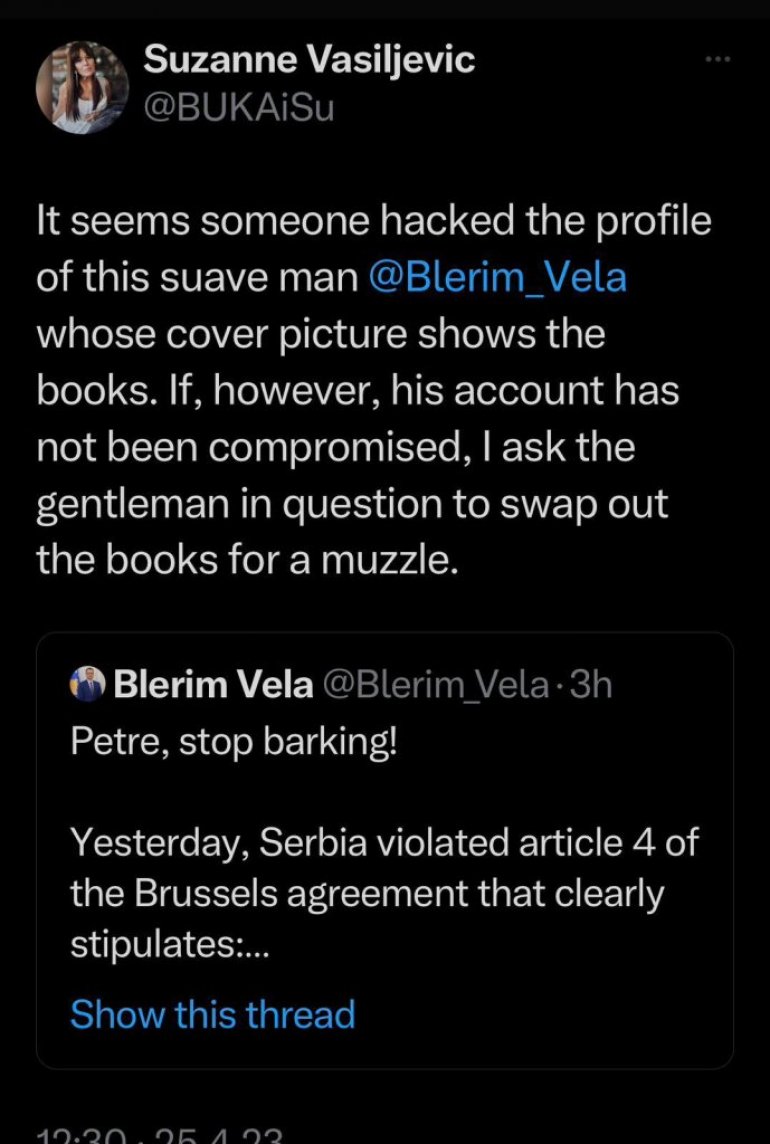 СУЗАНА Васиљевић, саветница за медије председника Србије Александра Вучића, одговорила је на Твитеру Блериму Вељи, шефу особља у тзв. председништву Косова, који је написао да је Србија прекршила Бриселски споразум јер је гласала против чланства тзв. Косова у Савету Европе и упутио увреде директору канцеларије за Косово и Метохију Петру Петковићу.