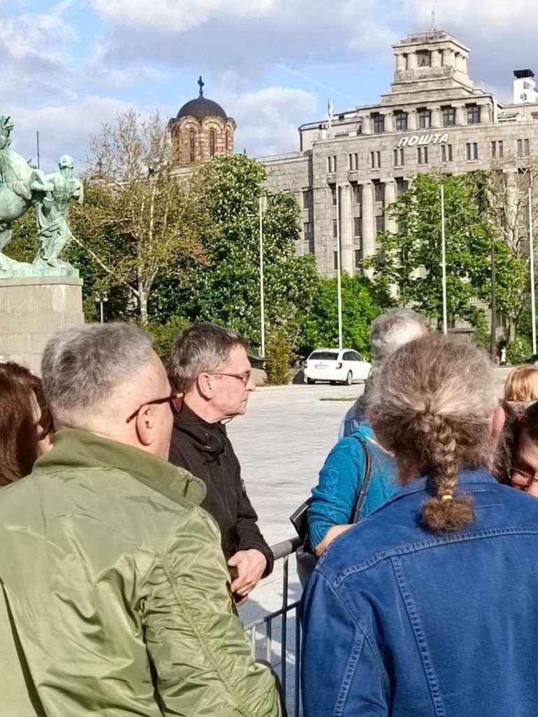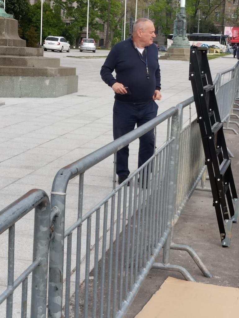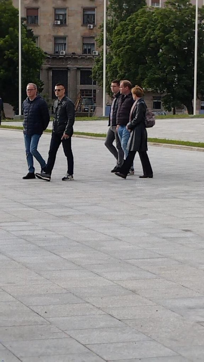 НА платоу испред Народне скупштине је у 17:30 часова стигли су Милован Бркић, главни и одговорни уредник "Таблоида, Пјотр Никитин из про-украјинске организације "Чини добро" и Дејан Петар Златановић, оснивач и уредник интернет портала "Србин. инфо".