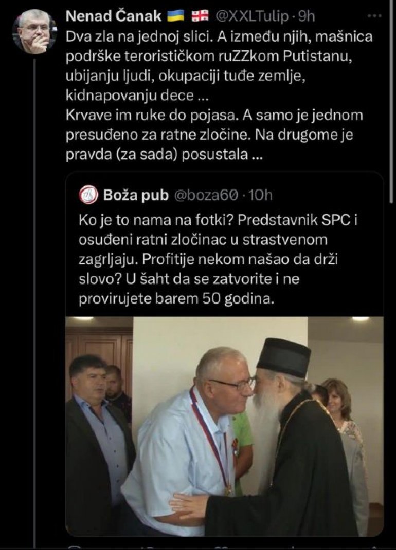 - Два зла на једној слици. А између њих, машница подршке терористичком руЗЗком Путистану, убијању људи, окупацији туђе земље, киднаповању деце... Крваве им руке до појаса. А само је једном пресуђено за ратне злочине. На другоме је правда (за сада) посустала ... - написао је Чанак.