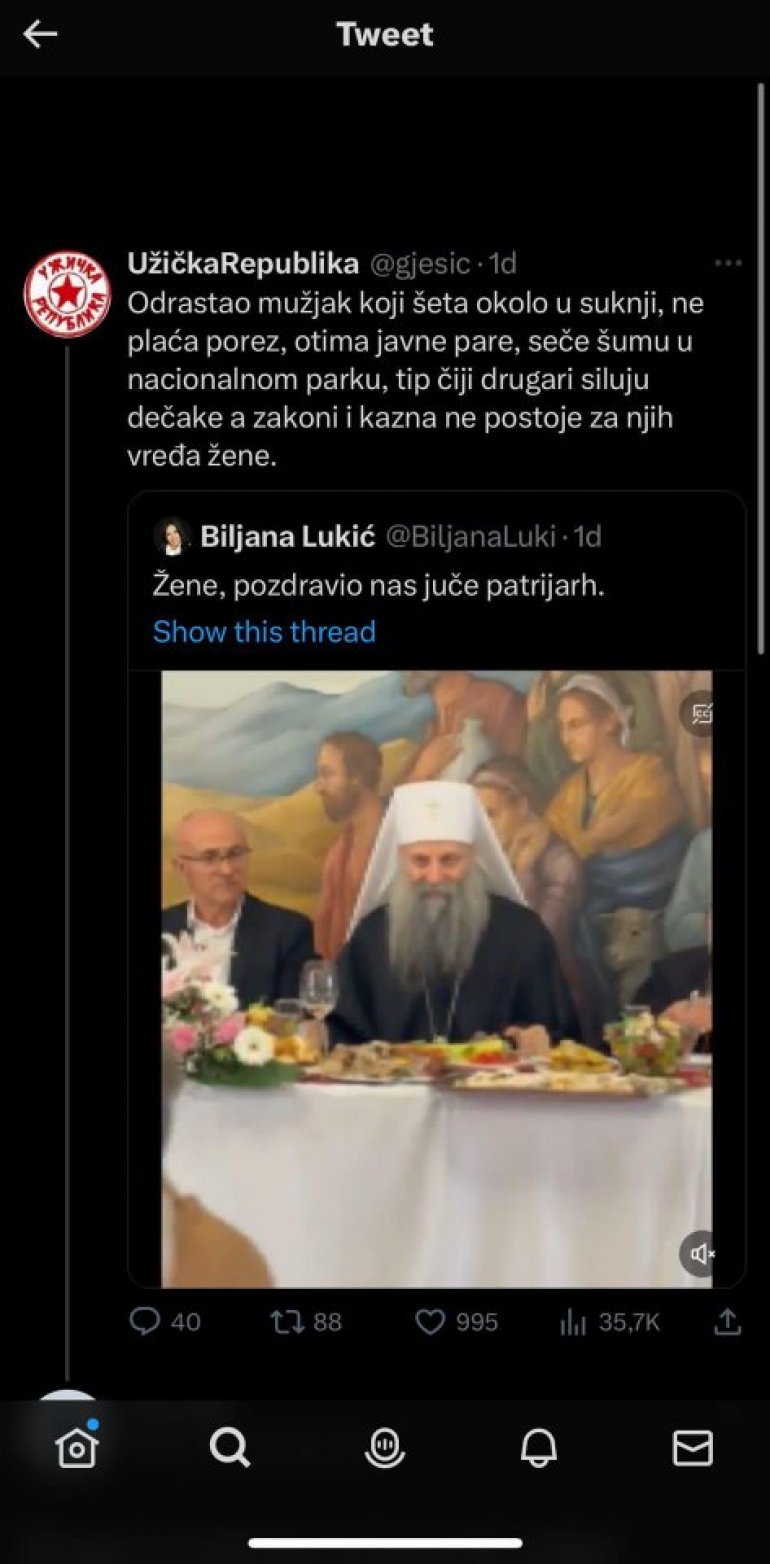 У бруталним увредама на друштвеним мрежама демократе износе да су "патријарх и свештеници перверзњаци који шетају у сукњама, силују дечаке, краду шуму и не плаћају порез".