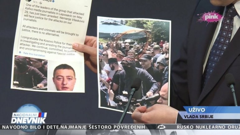 - Све у циљу реаговања Срба, не би ли међународна заједница окривила Београд или Србије. Јуче рано ујутру, Куртијев лажни министар Краснићи, док је била смена полиције, на превару је ушао у зграду општине у Лепосавићу, тамо је требао да дочека нове лажне одборнике и некакве директоре које су поставили по општинским департманима. Наш народ је реаговао бурно, али мирно. Они су дошли до саме зграде општине, до самог улаза, али поштујући КФОР и на њихову молбу, они су се повукли до ограда где иначе протестују и претходних дана. Након тога, опет у лепосавићу, покушано је хапшење још једног Србина, Ивана Миладиновића, а након тога Куртијева полиција ухапсила је Немању Влашковића, Србина, момка који је 90. годиште. Свечља је затим објавио на свом Фејсбук профилу, слику Немање Влашковића и још једну фотографију поред, где је означио да је овај момак који је маскиран Немања Влашковић. Притом је навео да се он хапси од догађаја од 29. маја, у Лепосавићу, због напада на албанску новинарску екипу - рекао је Петковић и показао фотографије.