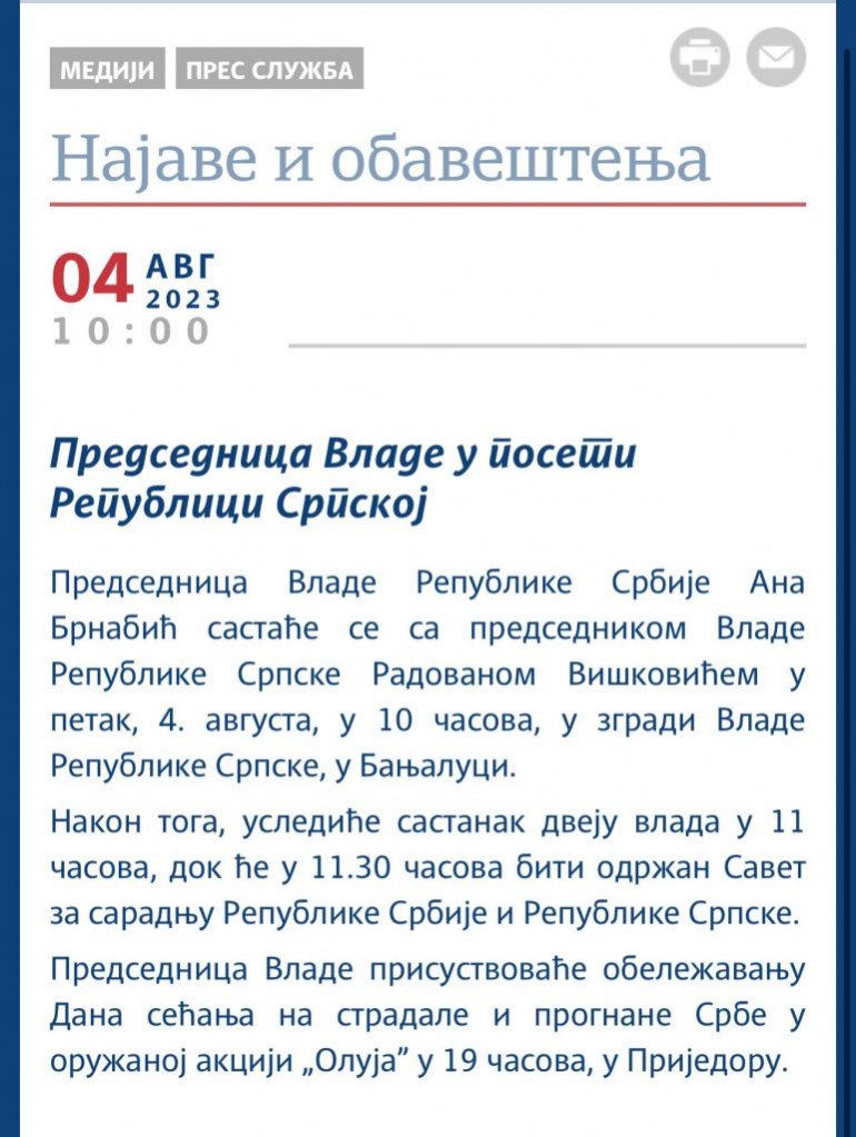 Посебно забрињава чињеница о неистинитом обавештавању јавности с обзиром на то да се од јуче, 3. августа 2023. године, од 13 часова, на званичном сајту Владе Републике Србије, у одељку "најаве и обавештења", налази најава о активностима премијерке Брнабић у Републици Српској у петак, 4. августа. У наставку је линк о активностима премијерке: