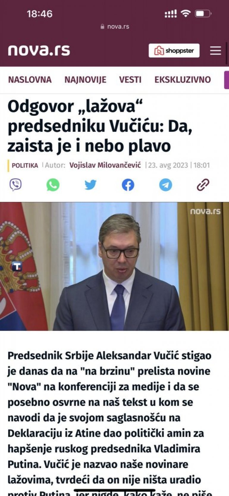 НИЈЕ мајка клела сина што се коцкао, већ што се вадио! Овом народном пословицом могао би да се окарактерише текст под насловом "Одговор „лажова“ председнику Вучићу: Да, заиста је и небо плаво" објављен на порталу Нова С, блиском опозицији, а у власништву контроверзног бизнисмена Драгана Шолака.