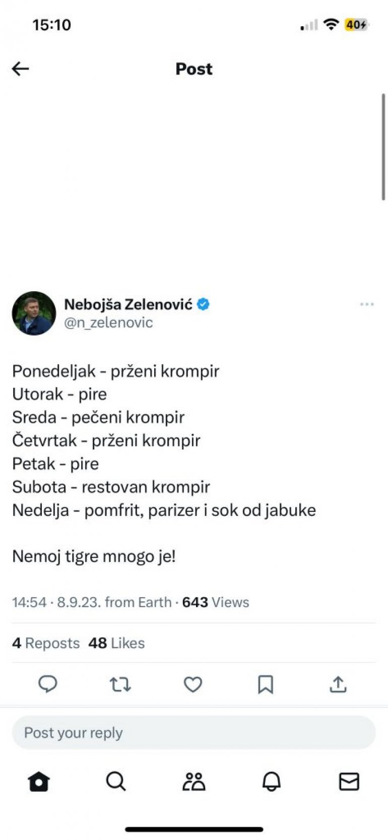 ПРЕДСЕДНИК странке "Заједно" Небојша Зеленовић реаговао је на данашњу најаву државних мера појефтињења прехрамбених производа.
