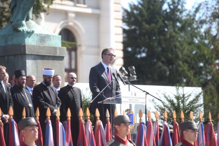 ПРЕДСЕДНИК Републике Србије Александар Вучић присуствовао је данас свечаности поводом промоције најмлађих официра Војске Србије и том приликом се обратио окупљенима испред Народне скуштине Републике Србије.