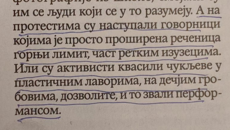 - А на протестима су наступали говорници којима је просто проширена реченица горњи лимит, част ретким изузецима. Или су активисти квасили чукљеве у пластичним лаворима, на дечјим гробовима, дозволите, и то звали перформансом - изјавио је Ковачевић.