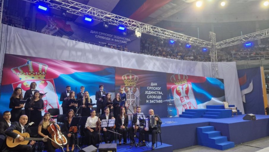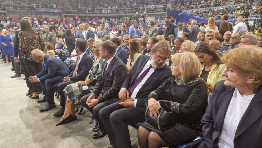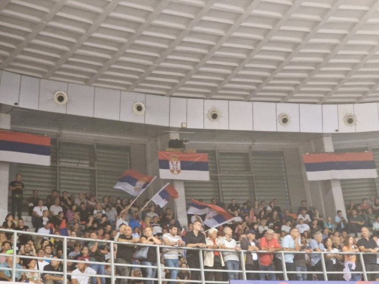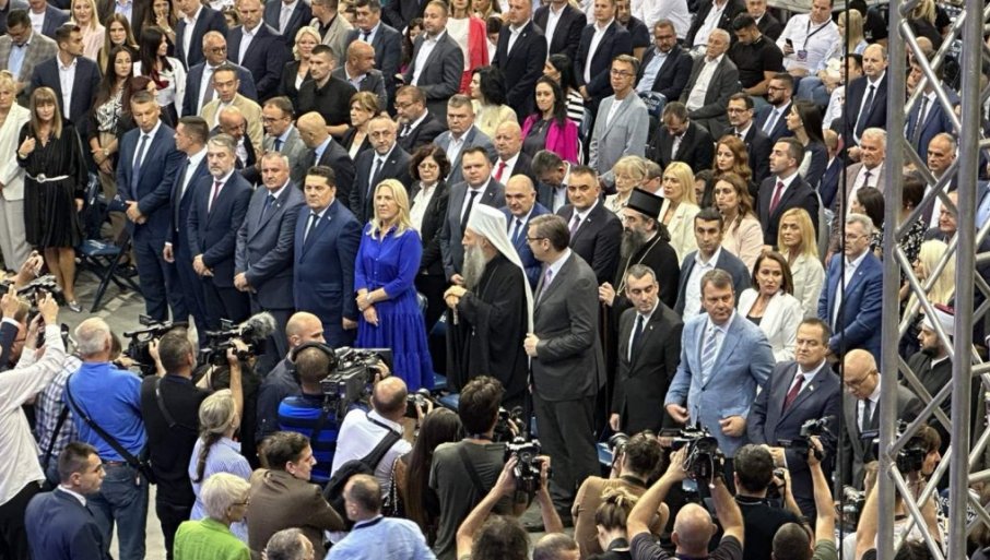 18.08. - Председник Вучић и патријарх Порфирије су у хали Чаир. Интонирана је химна Србије.