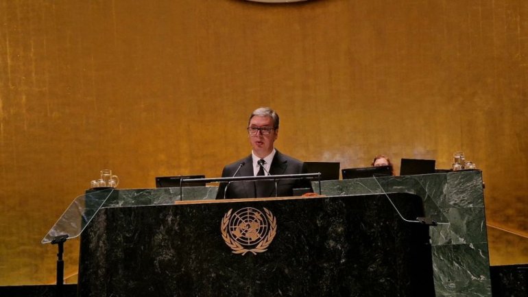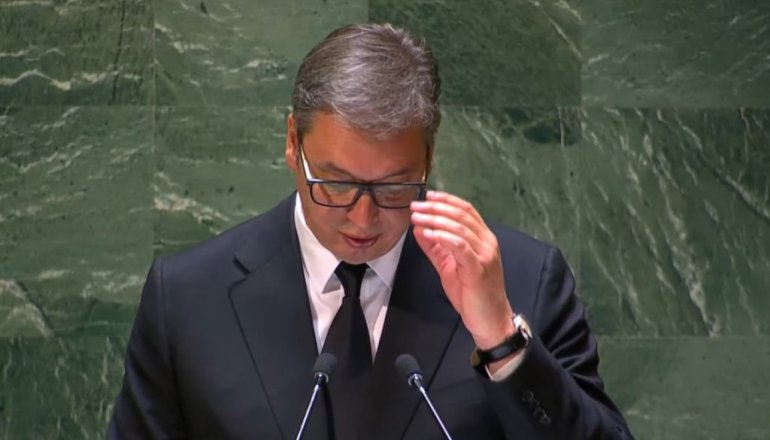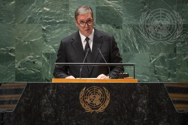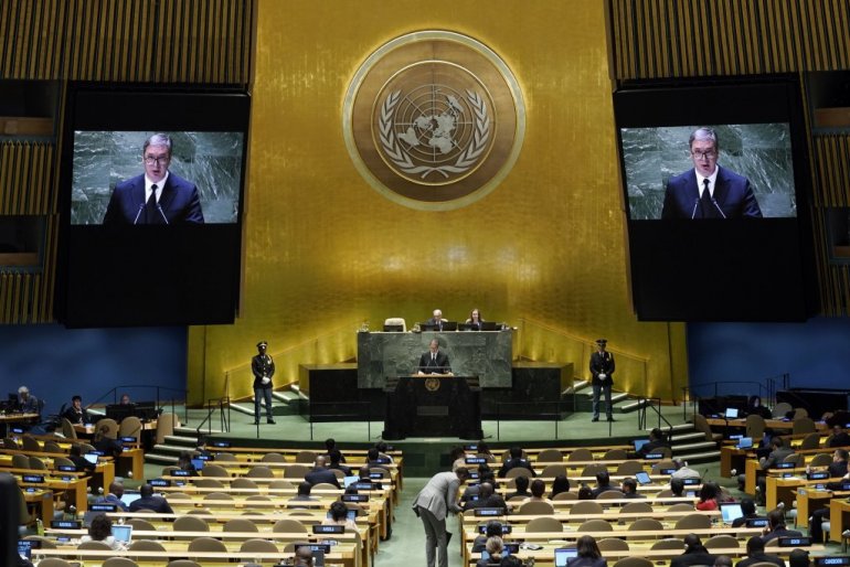 - Даме и господо, док последња три дана са ове говорнице сви заклињемо на поштовање принципа и правила Повеље УН, управо је кршење истих у корену већине проблема у међународним односима, а примена двоструких аршина отворена позивница за све оне који газећи норме међународног права, али и базичне људске моралности, ратом и насиљем остварују своје интересе. Сви говорници до сада, а верујем и сви после мене, говорили су о неопходности промена у свету истичући своју земљу као пример моралности и посвећености праву и светској правди. Данас нећу много говорити у суперлативу о својој земљи, о расту плата и пензија, стотинама изграђених километара ауто-путева и железничких пруга, новоизграђеним болницама и школама, научно-технолошким парковима, Институту за вештачку интелигенцију, пошто се подразумева да штитим њене интересе и да је волим највише на свету. Али ћу говорити о принципима који су гажени и који су нас довели у данашњу ситуацију, и то не од стране малих, који су неретко мета напада, већ од стране најмоћнијих земаља света, посебно оних које су себи дале за право, да читавом свету, свака из свог угла, држе политичке и моралне лекције. Овде у овој сали, пре само два дана, могли смо да чујемо од председника Америке, да је најважнији принцип у односима између држава поштовање њиховог територијалног интегритета и суверенитета, а тек као трећи фактор по значају, поменута су људска права. И чинило ми се да су сви у овој сали то подржали. Ја као председник Србије сам то поздравио са нескривеним одушевљењем. Једини проблем у свему томе, била је чињеница што сам неколико сати после његовог говора морао да видим председницу такозваног Косова, коју најмоћнији део Запада сматра председницом независне државе, која је иначе настала сецесијом од територије Републике Србије - рекао је српски председник.