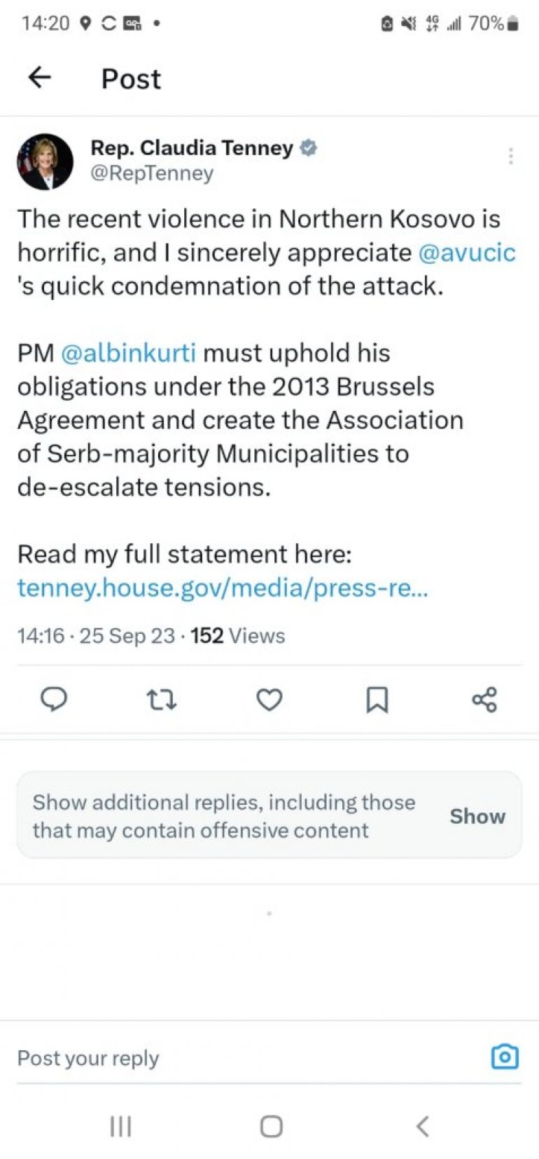 - Недавно насиље на северу КиМ је неприхватљиво и искрено ценим брзу осуду напада премијера Србије Александра Вучића. Владе Србије и (тзв.) Косова морају да се уздрже од реторике и акција које могу додатно да подстакну тензије. Већ месецима сам забринута због потенцијалне ескалације насиља и третмана косовских Срба од стране Аљбина Куртија. Зато сам раније овог месеца послала писмо премијеру Куртију у којем га позивам да деескалира тензије и сачува права косовских Срба. Још једном позивам на потпуну заштиту људских и политичких права свих мањина на КиМ, посебно српског цивилног мањинског становништва, истовремено позивајући Куртија да се придржава својих постојећих обавеза према Бриселском споразуму из 2013.