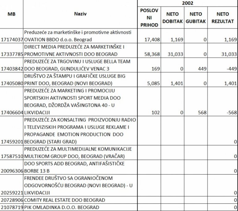 - Предузеће за маркетиншке и промотивне активности ОВАТИОН ББДО д.о.о. Београд- 322,790.000 динара