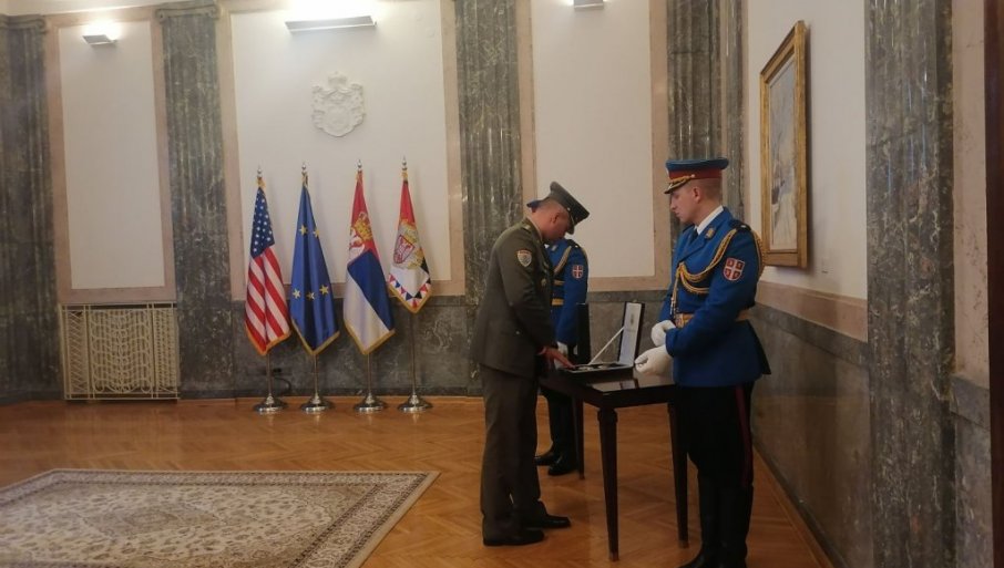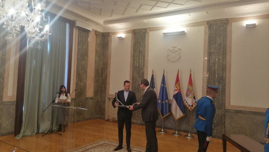 ПРЕДСЕДНИК Александар Вучић уручио је Ричарду Гренелу Орден српске заставе првог степена за истакнуте заслуге у развијању и учвршћивању мирољубиве сарадње и пријатељских односа између Србије и Сједињених Америчких Држава.