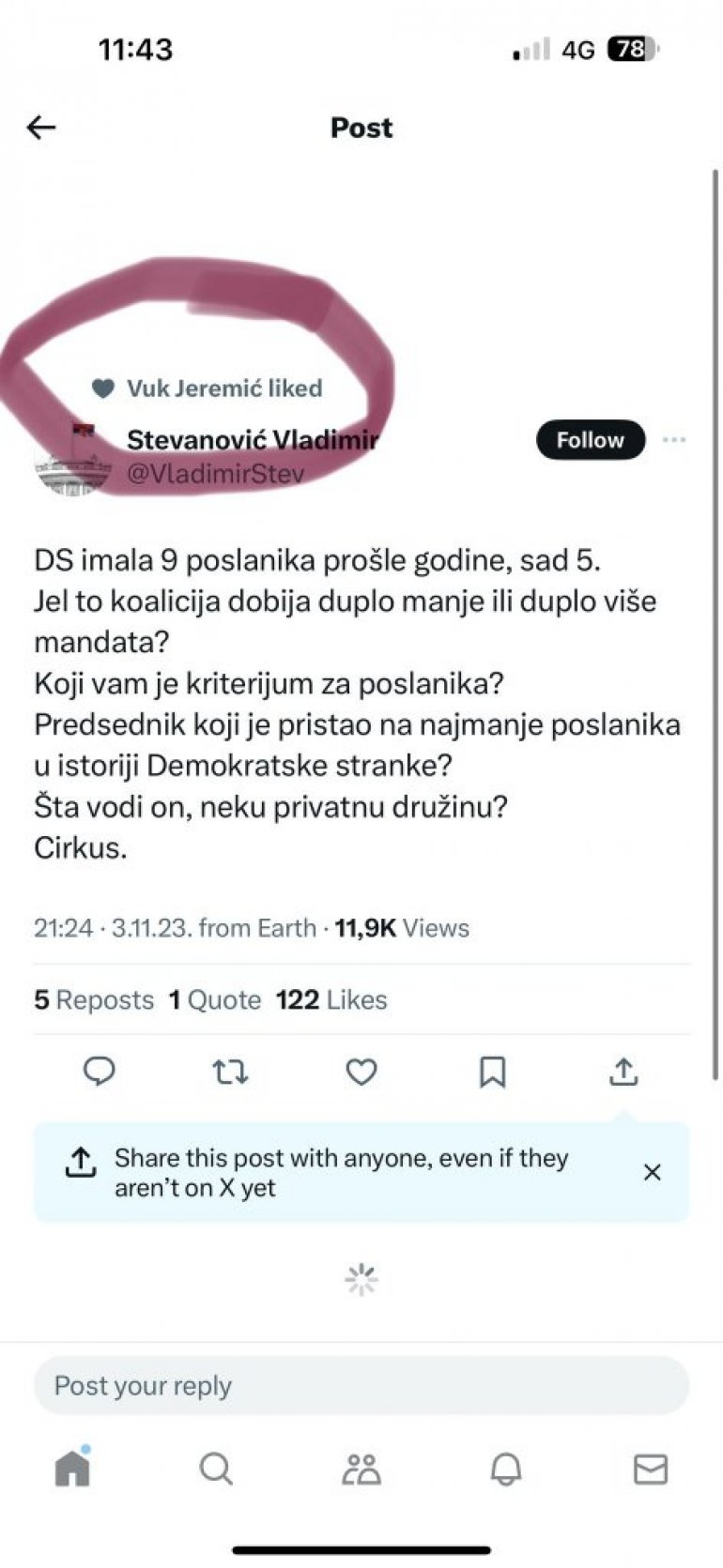 ЛИДЕР Народне странке Вук Јеремић лајковао је објаву Владимира Стевановића на друштвеној мрежи Икс у којој Стевановић наводи да је у ДС циркус.