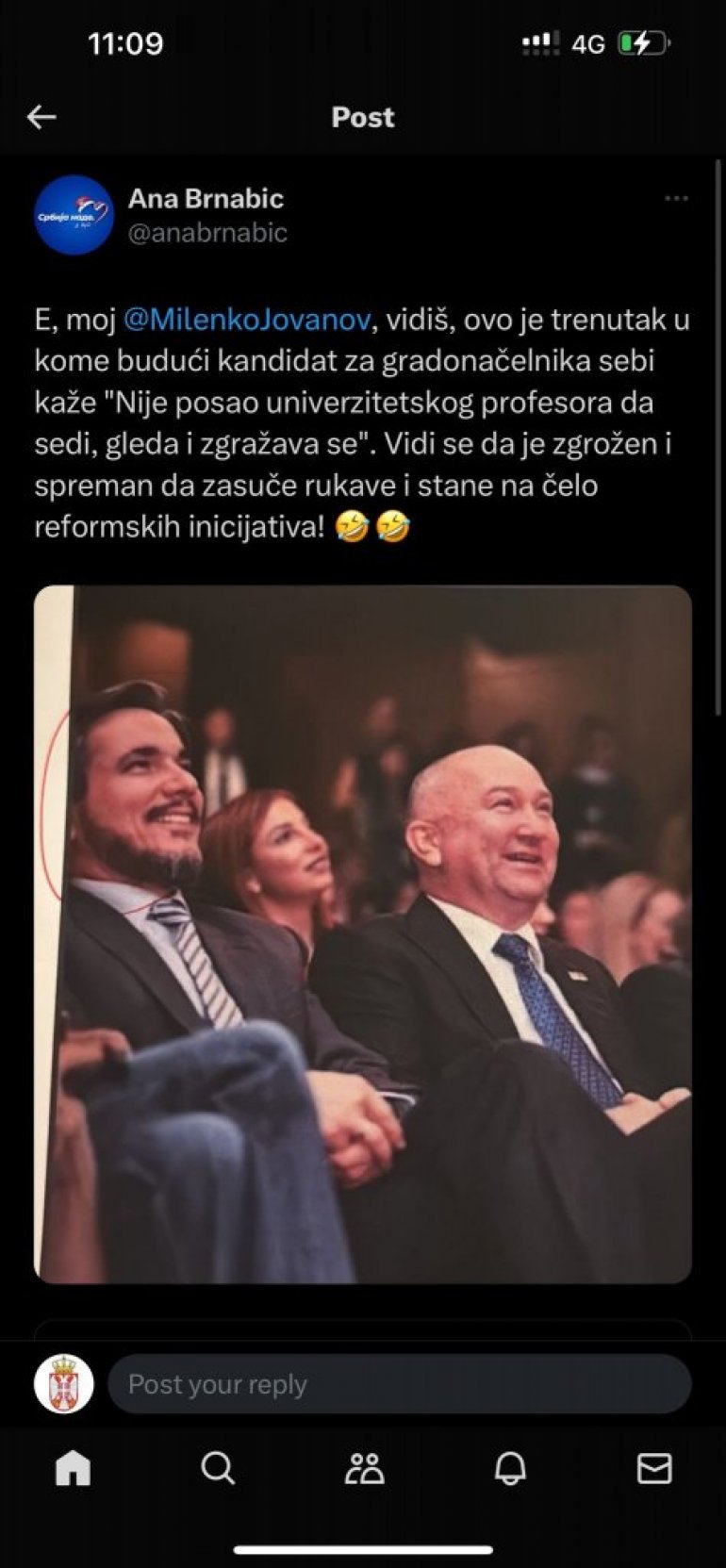 - Е, мој Миленко Јованов, видиш, ово је тренутак у коме будући кандидат за градоначелника себи каже "Није посао универзитетског професора да седи, гледа и згражава се". Види се да је згрожен и спреман да засуче рукаве и стане на чело реформских иницијатива! - написала је премијерка.