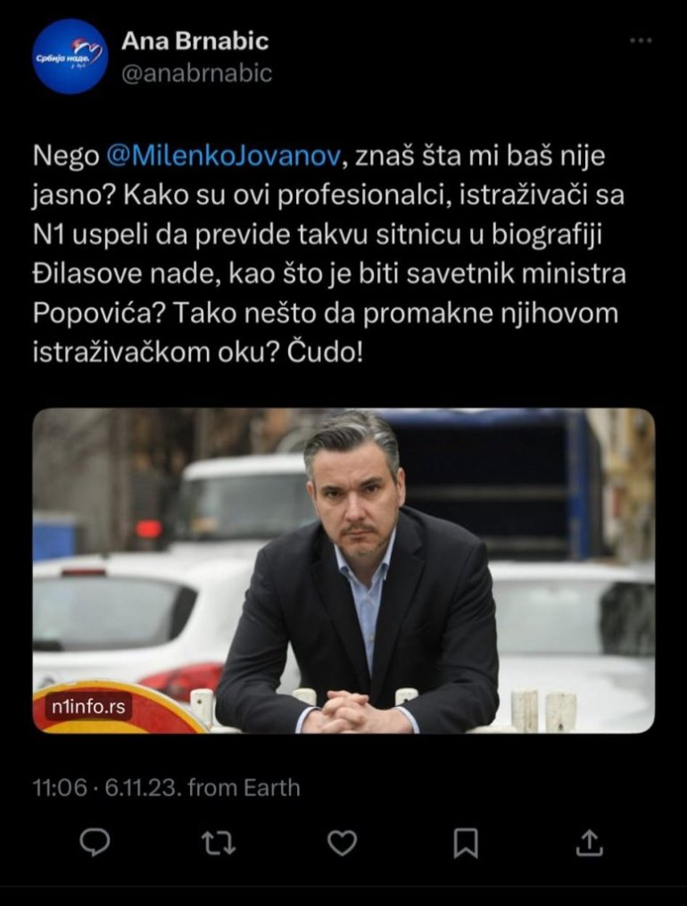 - Него, Миленко Јованов, знаш шта ми баш није јасно? Како су ови професионалци, истраживачи са Н1 успели да превиде такву ситницу у биографији Ђиласове наде, као што је бити саветник министра Поповића? Тако нешто да промакне њиховом истраживачком оку? Чудо!