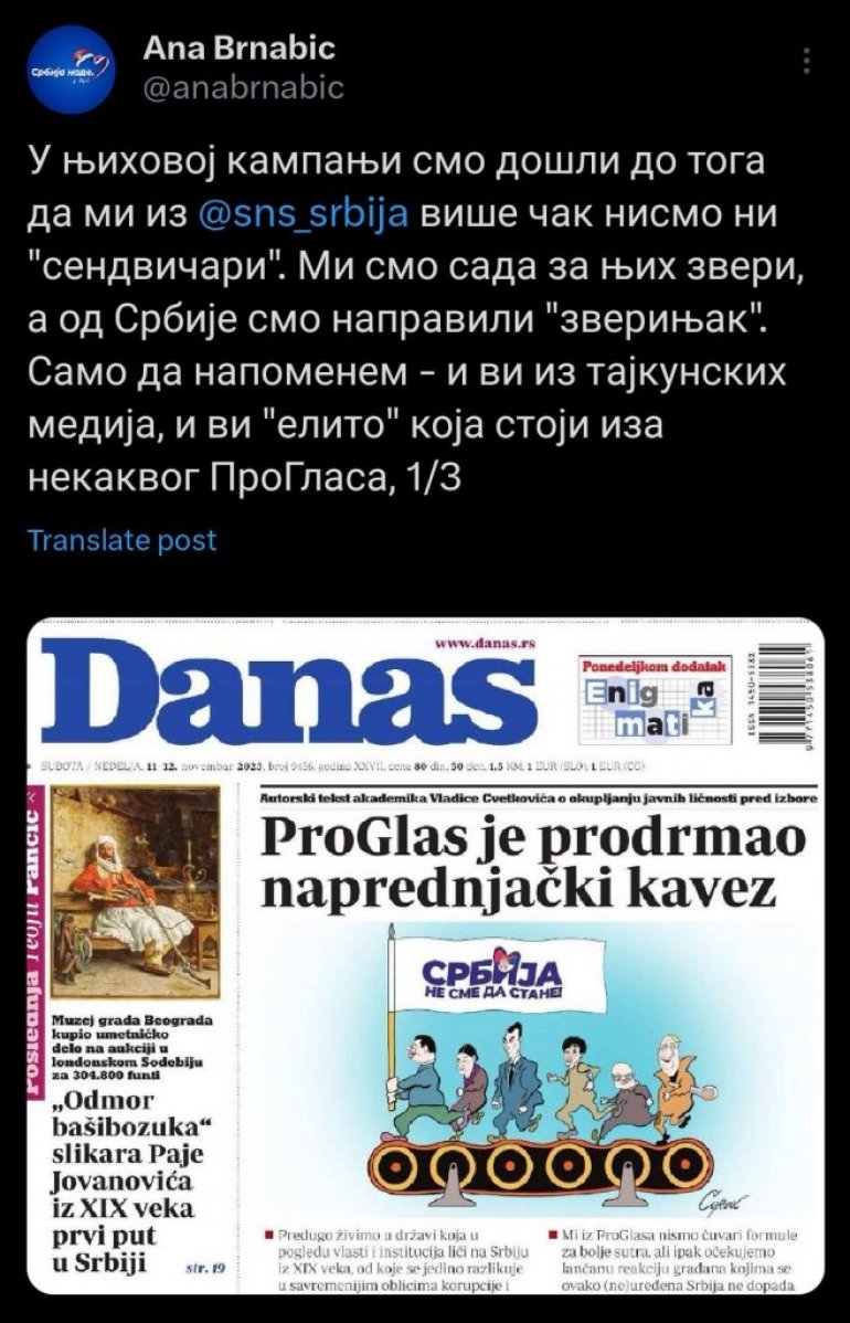 - У њиховој кампањи смо дошли до тога да ми из СНС Србија више чак нисмо ни "сендвичари". Ми смо сада за њих звери, а од Србије смо направили "зверињак". Само да напоменем - и ви из тајкунских медија, и ви "елито" која стоји иза некаквог ПроГласа, и ви који сте отели грађански покрет "против насиља" и регистровали га у кафани "Естрада" у Шапцу, а онда тако назвали вашу листу, зверима називате огромну већину нормалних и пристојних грађана Србије који гласају за резултате, плате, путеве, пруге, научно-технолошке паркове, здравство, веће пензије.... за план и програм, и неће дати, да их ви, или било ко други, са ваших "висина" вређа. Одговор ћете, од свих оних које називате "зверима", а нашу Србију зверињаком, добити 17. децембра. При том - те "звери" враћају слику Паје Јовановића у Србију.... - истакла је Брнабић на свом званичном Твитер (Икс) профилу, притом поделивши насловну страну листа "Данас".