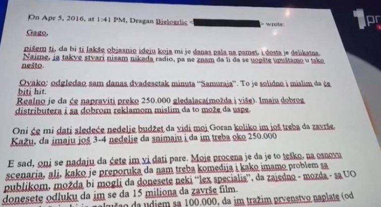 РЕДИТЕЉ Гага Антонијевић изјавио је да му је Драган Бјелогрлић нудио паре као члану Комисије за доделу средстава за кинематографију, наводећи да постоје мејлови као доказ, а који су, према налазима судског вештака, аутентични.