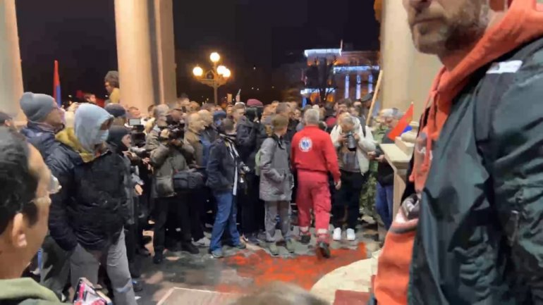 У 19:57 часова, демонстранти су просули извесну течност из жутог канистера испред улаза у Градску скупштину. С тим у вези, постоје индиције да су исти желели да поменуту боју искористе како би прскали зграду Градске скупштине.