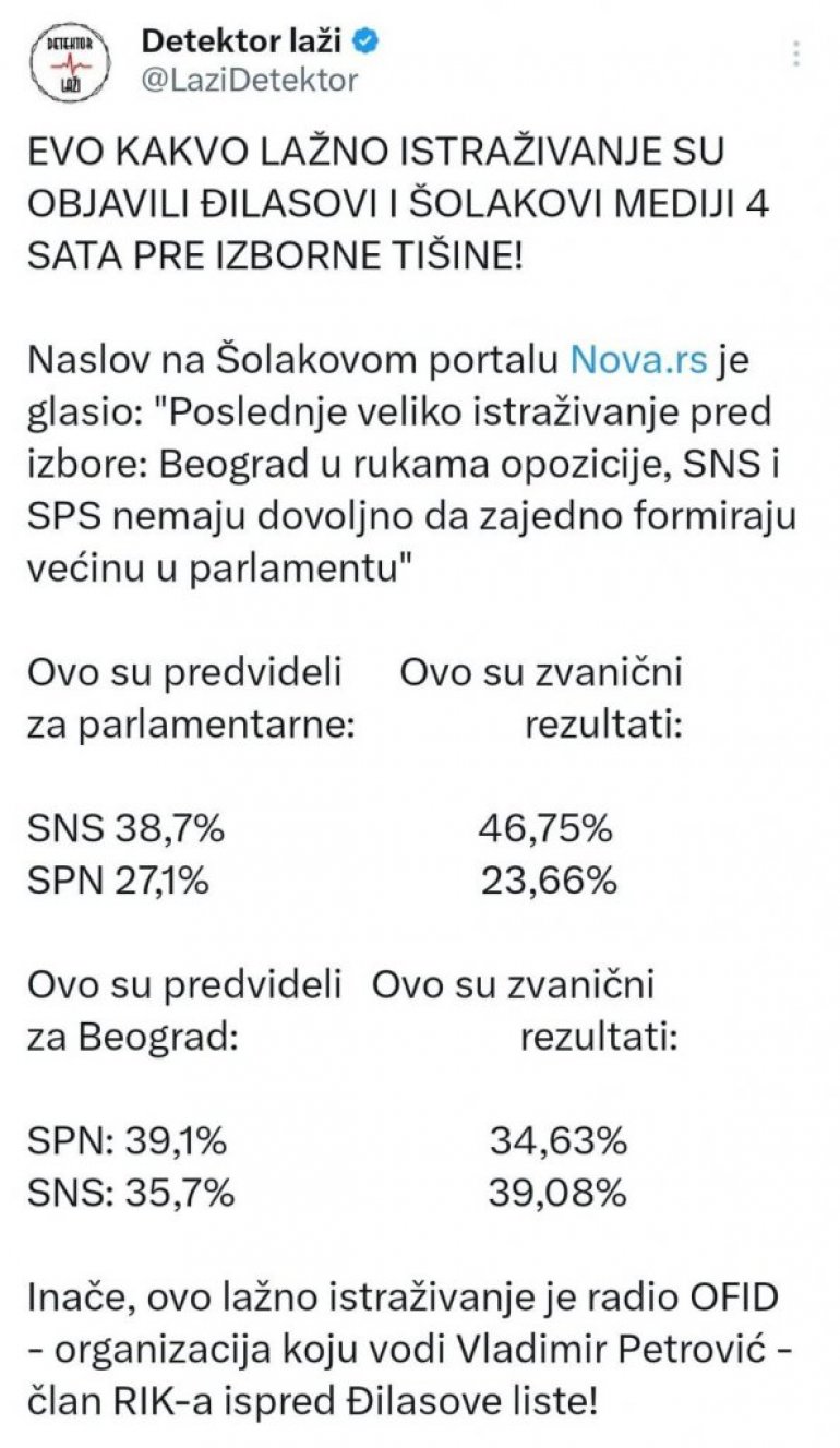 Иначе, ово лажно истраживање је радио ОФИД - организација коју води Владимир Петровић - члан РИК-а испред Ђиласове листе!