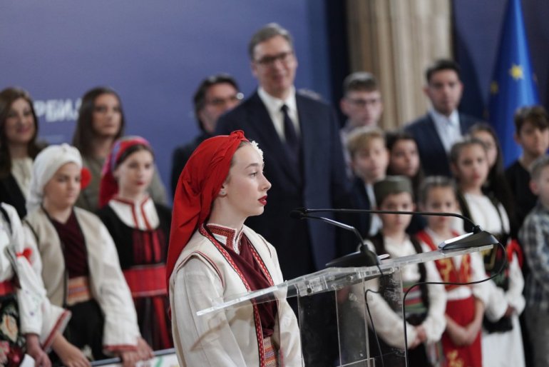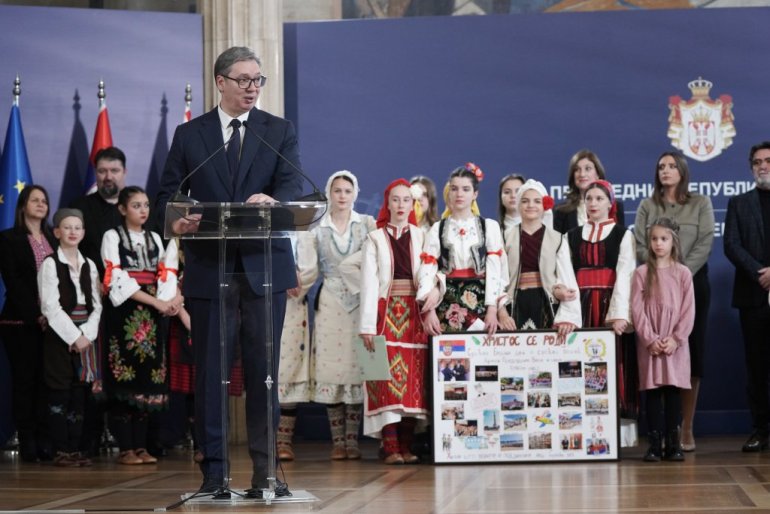 - Драга децо и учитељи, васпитачи, наставници. Хвала вам што сте данас у Београду, у Србији. Свима који долазите из Скопља, Куманова, Битоља, Тетова, срећан сам што на Бадњи дан могу да вас угостим. Чини ми се да је владика Николај Србима најбоље описао Божић - рекао је Вучић, након чега је прочитао речи владике Николаја.