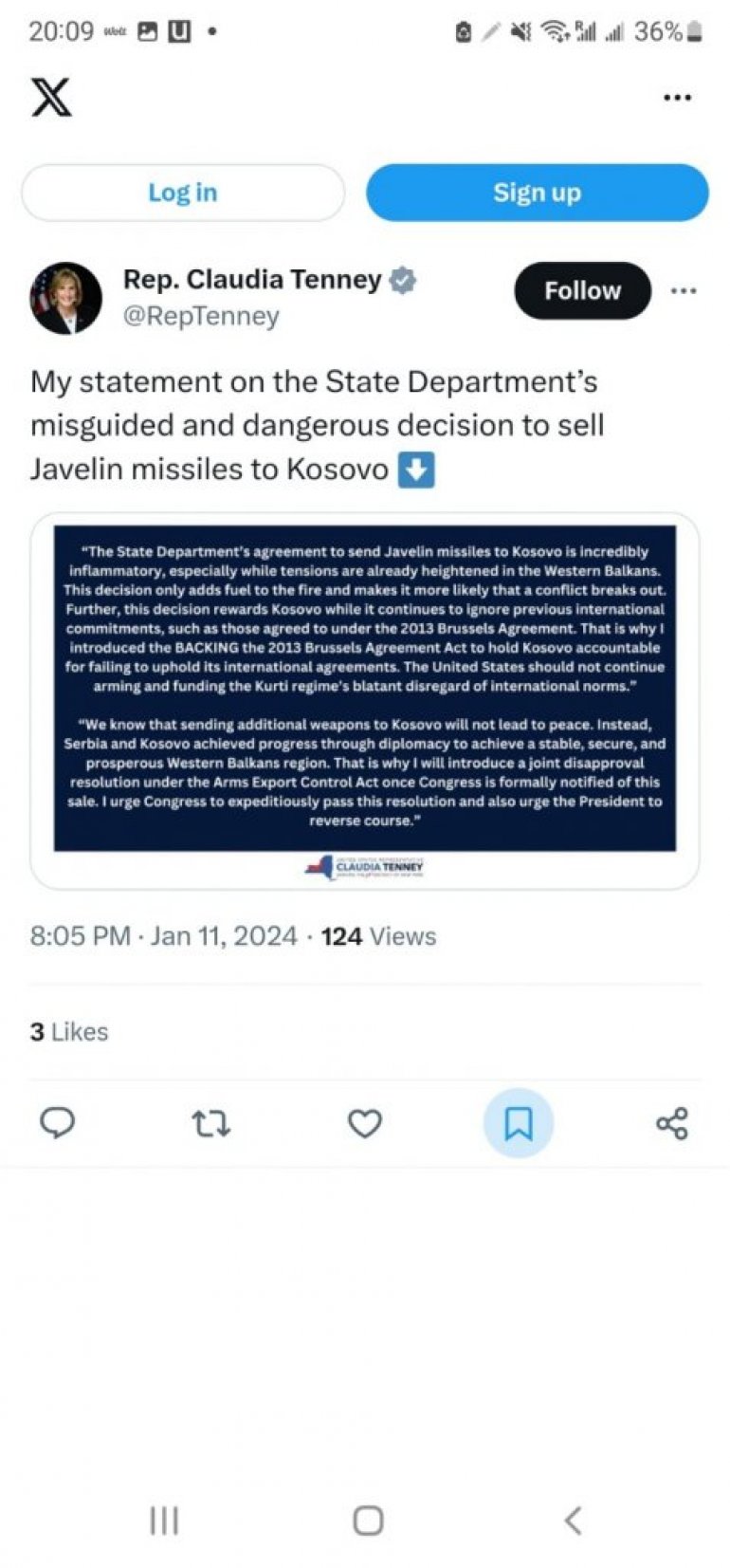 КОНГРЕСМЕНКА из Њујорка и копредседавајућа српског кокуса у Конгресу Клаудија Тени се оштро успротивила одлуци Стејт департмента о продаји противтенковских ракета "џавелин" тзв. Косову.