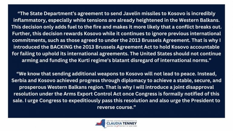 - Пристанак Стејт Департмента да пошаље ракете "Џавелин" на Косово је невероватно запаљив, посебно док су тензије већ појачане на Западном Балкану. Ова одлука само долива уље на ватру и чини вероватнијим да избије сукоб. Даље, ова одлука награђује тзв. Косово док оно наставља да игнорише претходне међународне обавезе, као што су оне договорене Бриселским споразумом из 2013. године. Зато сам представила ПОДРЖАВАЊЕ Акта Бриселског споразума из 2013. како би се тзв. Косово сматрало одговорним за непоштовање међународних споразума. Сједињене Државе не би требало да наставе да наоружавају и финансирају очигледно непоштовање међународних норми од стране Куртијевог режима.