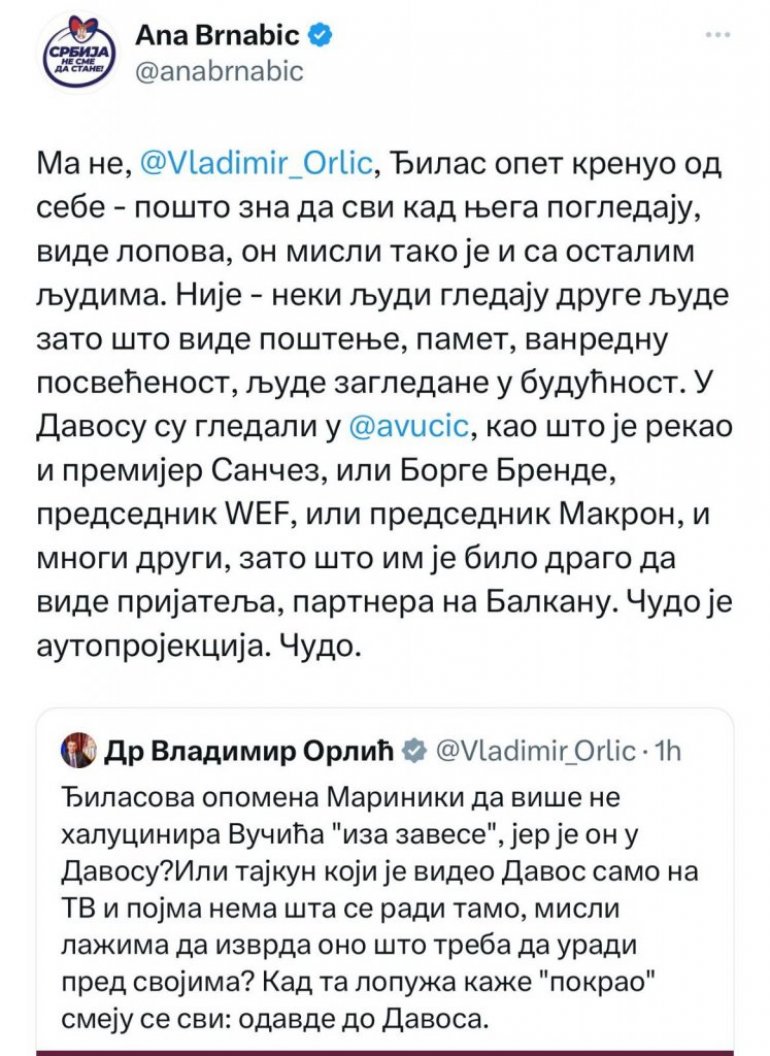 - Ма не, Ђилас опет кренуо од себе - пошто зна да сви кад њега погледају, виде лопова, он мисли тако је и са осталим људима. Није - неки људи гледају друге људе зато што виде поштење, памет, ванредну посвећеност, људе загледане у будућност. У Давосу су гледали у Александра Вучића, као што је рекао и премијер Санчез, или Борге Бренде, председник WFE, или председник Макрон, и многи други, зато што им је било драго да виде пријатеља, партнера на Балкану. Чудо је аутопројекција. Чудо - написала је премијерка на свом званичном Икс налогу.