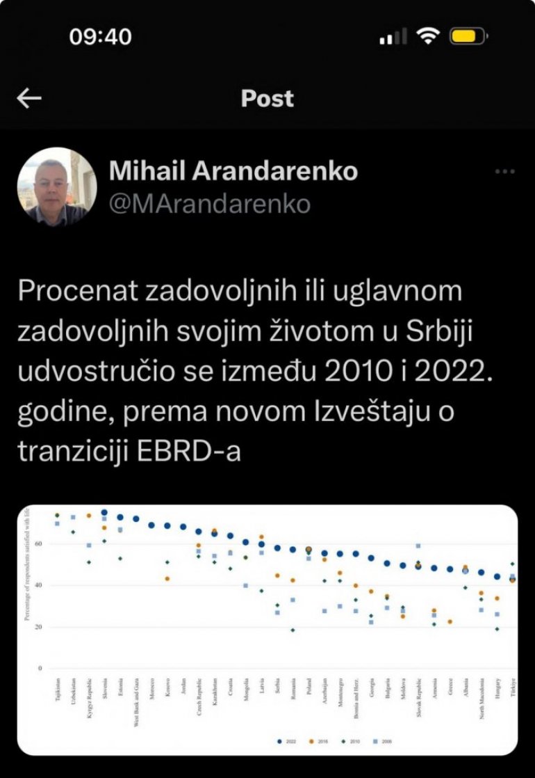 ПРОФЕСОР на Економском факултету Михаил Арандаренко изнео је на свом званичном Икс налогу нов Извештај о транзицији ЕБРД-а.