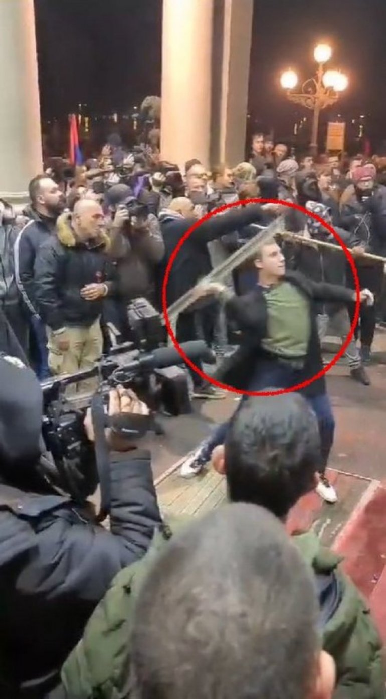 Е, али онда се појавио снимак. Ево га, извол’те погледајте. Тај ‘добар дечко, узорни студент’ Димитрије Радовановић је 24. децембра прошле године испред Скупштине града Београда моткама нападао полицајце!?! Јасно се види како он лично мотку баца на полицајце, нечије синове, браћу, очеве. Очигледно је са снимка и да студент Димитрије одушевљено подржава хулигане који око њега такође крвнички нападају полицајце.