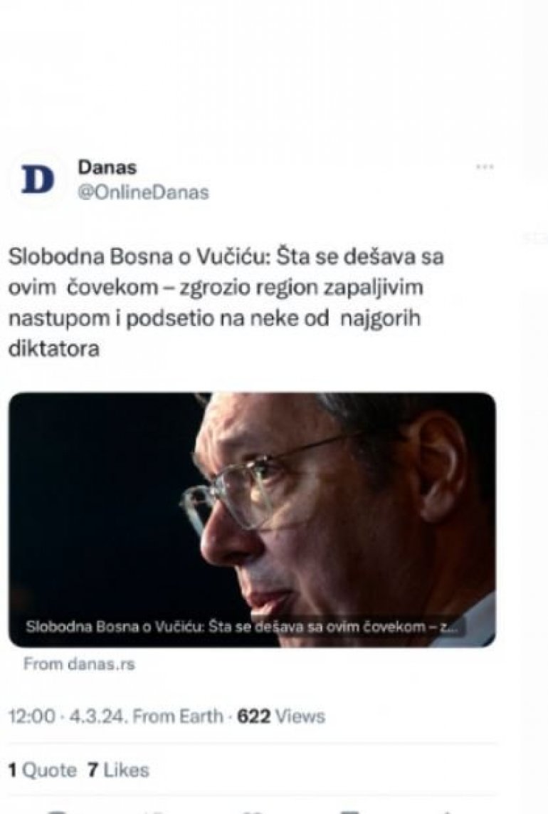 Исламистичка Слободна Босна, баш као и Куртијеви медији, јутрос су поредили Вучића са Хитлером критикујући његов говор у коме позива на јединство и победу, тврдећи да је „запаљив“, те да подсећа на „на најгорег диктатора прошлог века“, мислећи на Хитлера.