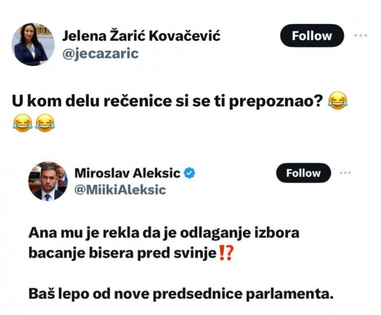 - Ана му је рекла да је одлагање избора бацање бисера пред свиње. Баш лепо од нове председнице парламента - написао је Алексић, на шта се надовезаала Жарић Ковачевић рекавши: