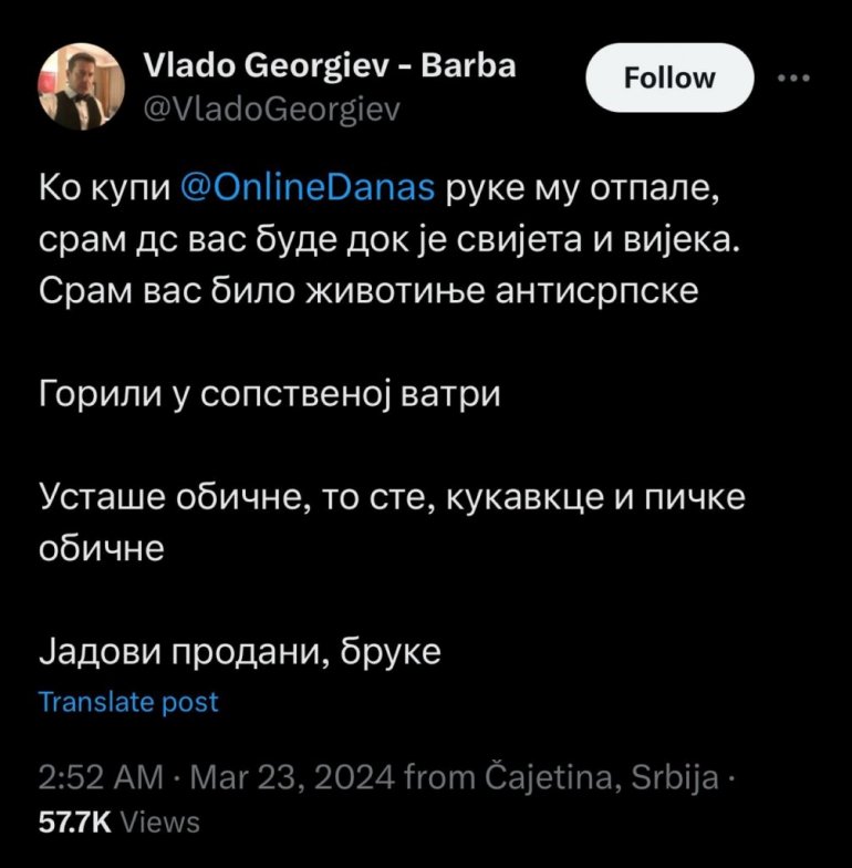 - Ко купи "Данас" руке му отпале, срам да вас буде док је свијета и вијека. Срам вас било животиње антисрпске. Горили у сопственој ватри. Усташе обичне, то сте, кукавкце и пи**е обичне. Јадови продани, бруке - написао је Георгиев.